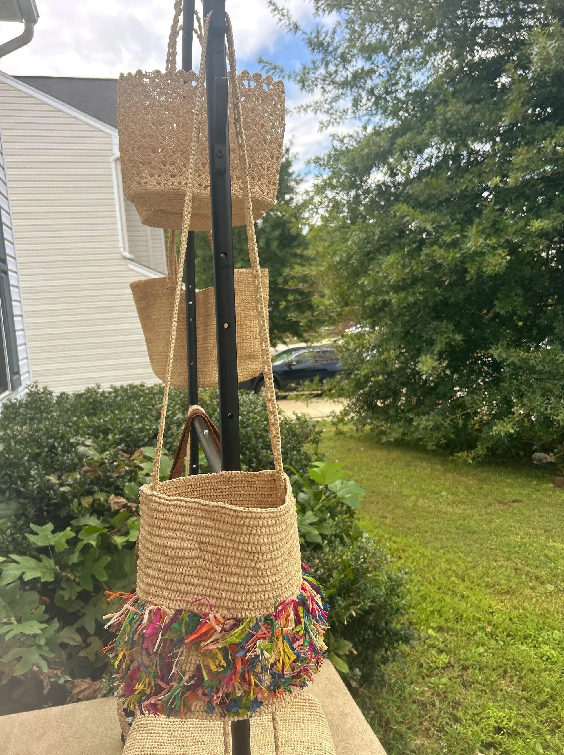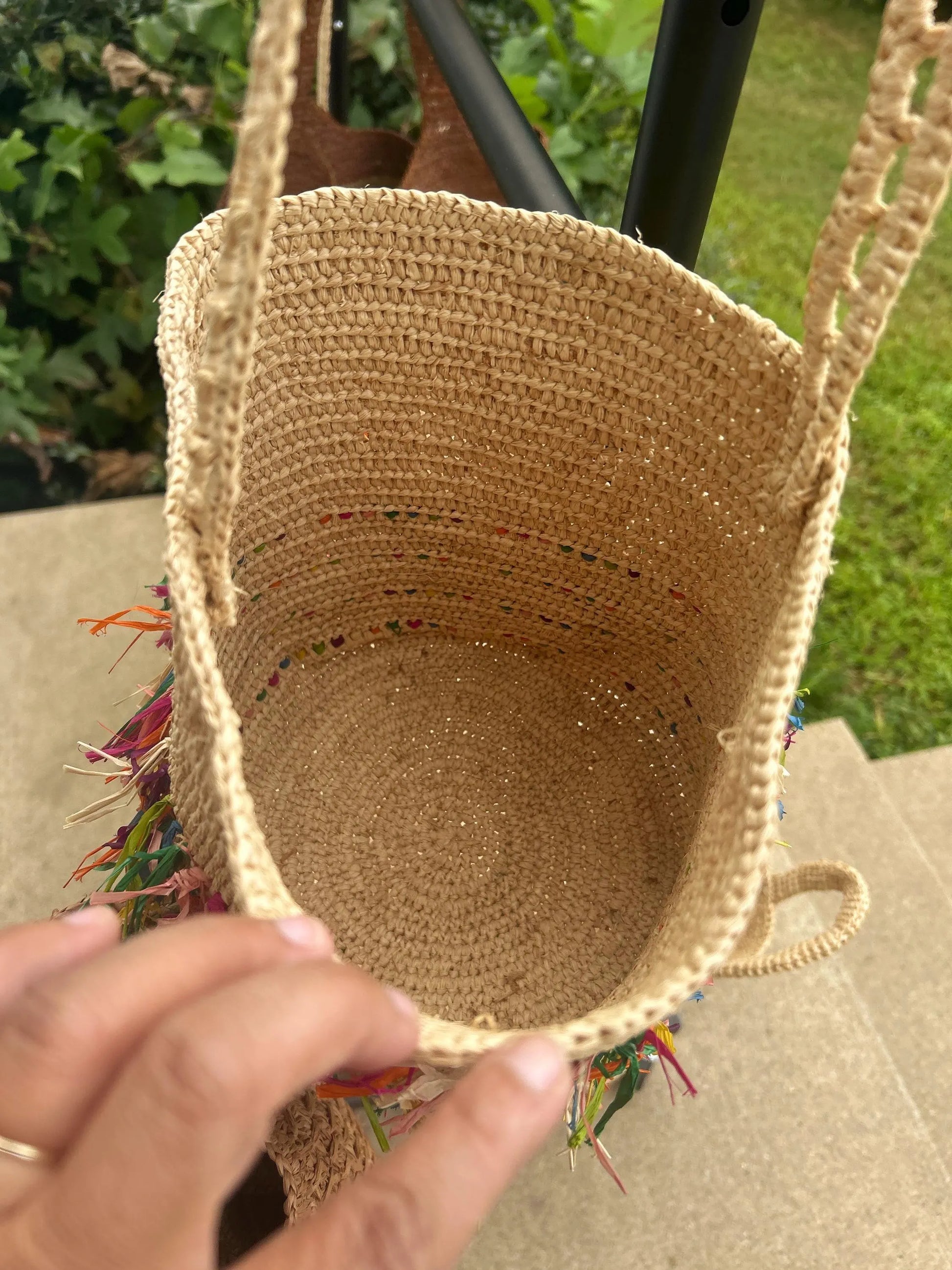 Cute Madagascar raffia bucket bag with colorful frills and stylish strap.