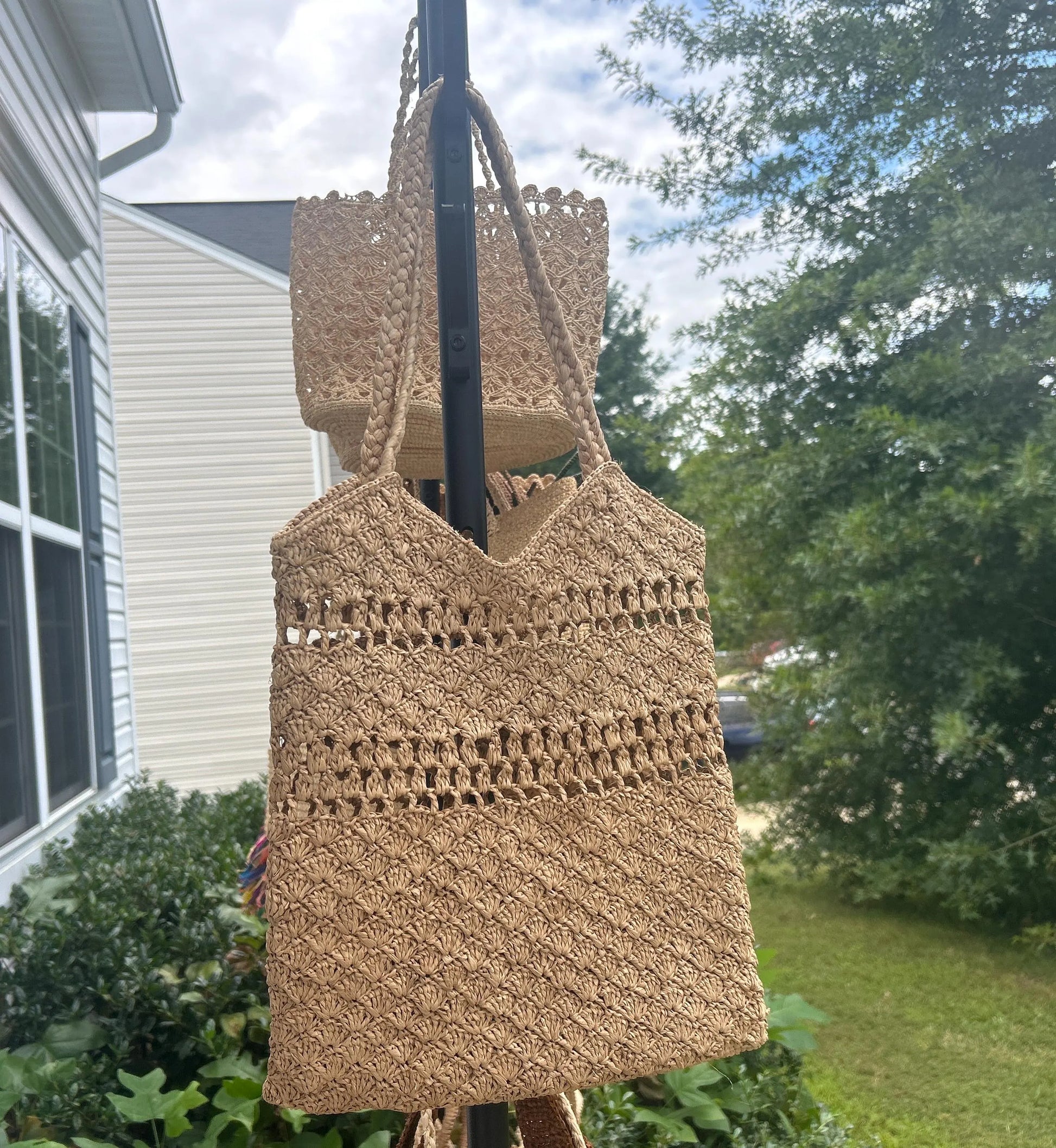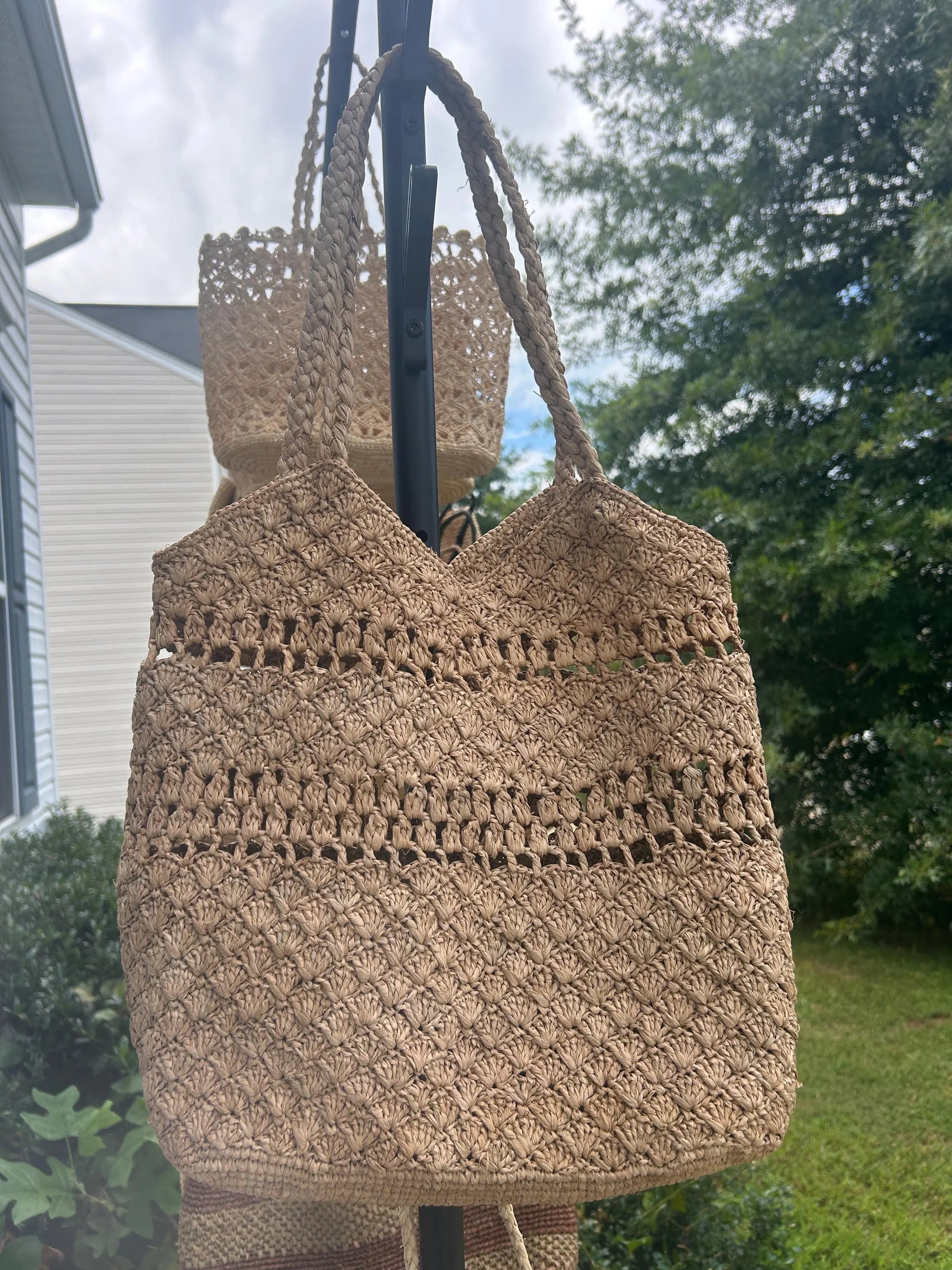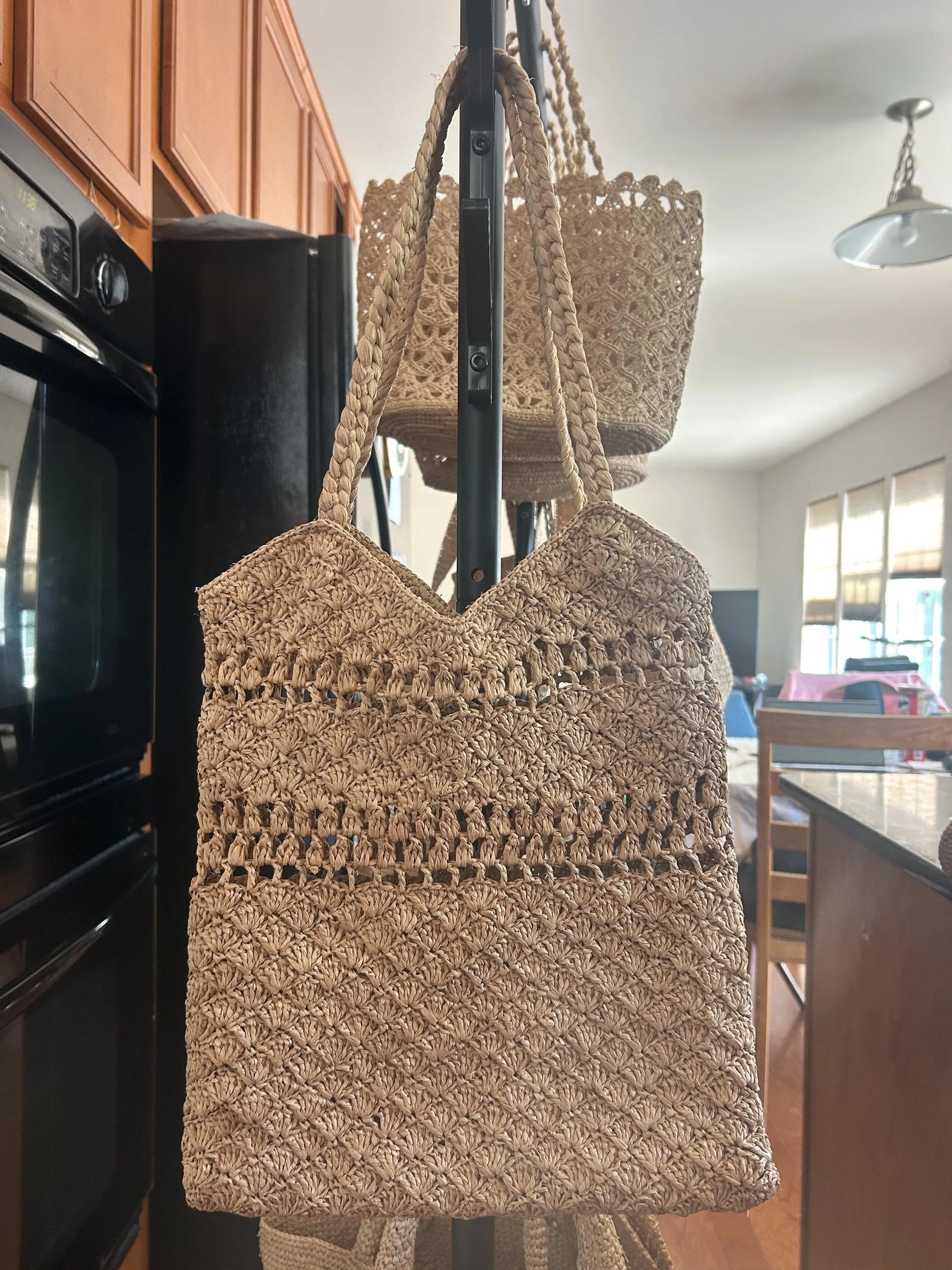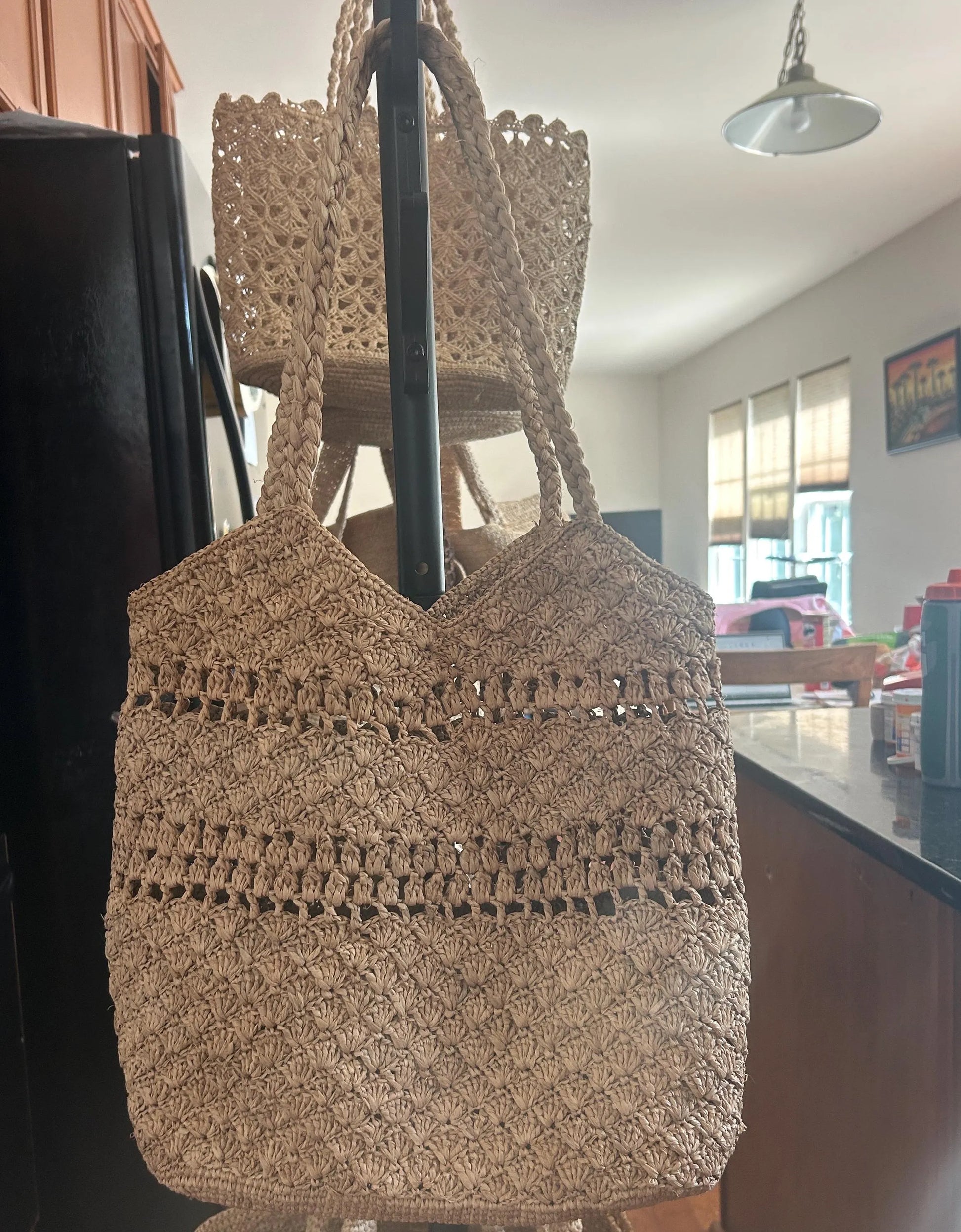 Picture 4,5,6: 14x3.5x12"(h); Drop: 9" ; Color: Brown ; 100% Madagascar raffia